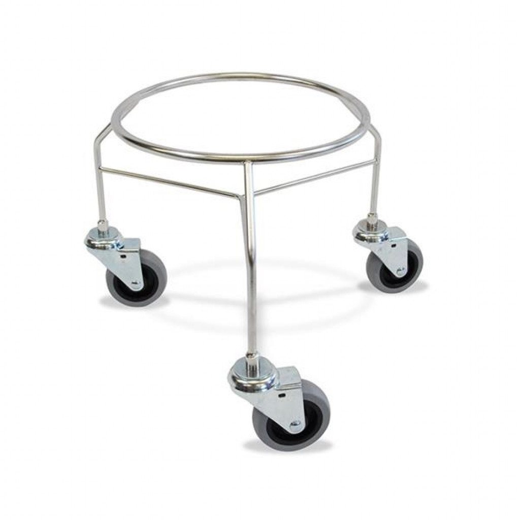 Bøttestativ i rustfritt stål. Hjul: 3 stk Svinghjul Ø 75 mm. Mål: L= 33 cm, B= 33 cm, H= 27 cm.
