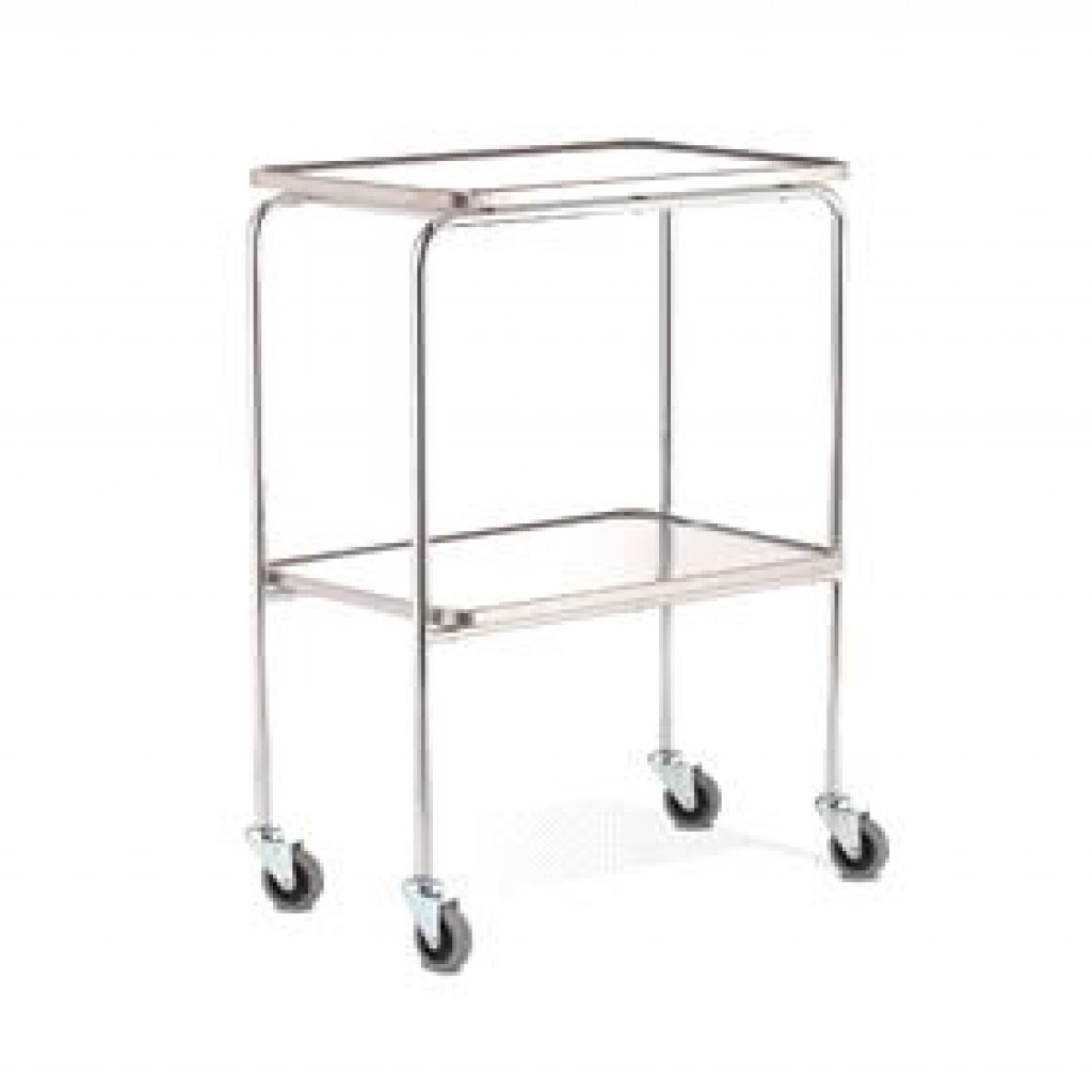 Stativ: Helsveiset forkrommet stålrør. Faste bordplater: Rustfri bordplate med vulstkant. Plastbelagte trefiberplater på platenes underside, for effektiv lyddemping. Hjul: 75 mm leddhjul med grå slitebane. Mål: Høyde 85 cm. Avstand mellom platene: 37 cm.