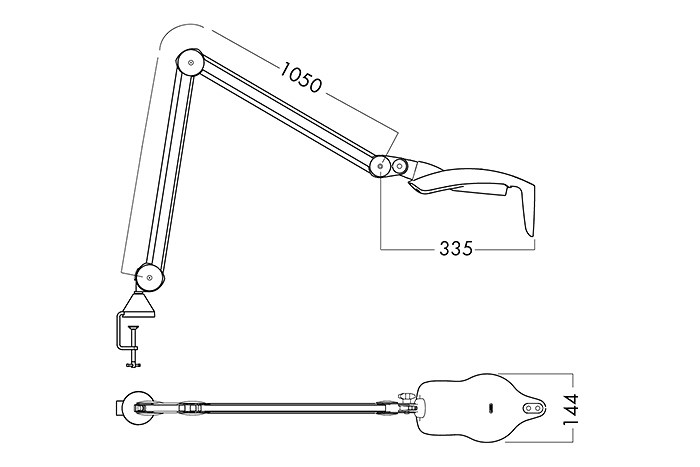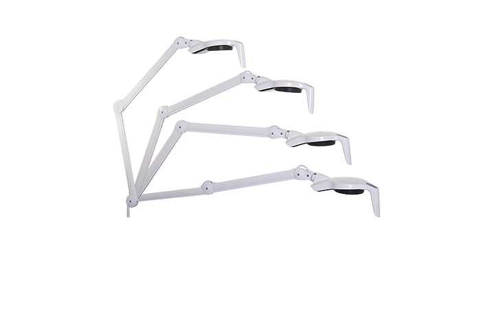 - Armteknologi og bevegelse: Parallell, tre-leddet arm for vegg (W), bord (T) eller tak (C). Spesiell versjon for Trolley er merket "TR". Armlengde er 105 cm.
